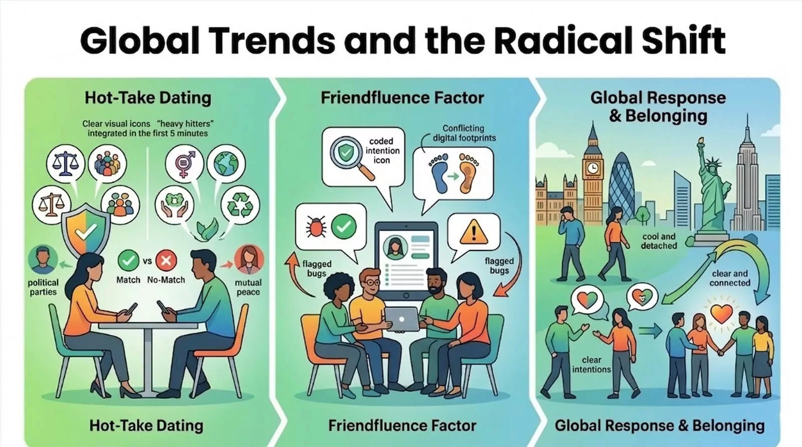 The impact of this shift is moving far beyond individual phone screens. In 2026, we are seeing the rise of Hot-Take Dating. This is the integration of heavy hitters into the first five minutes of contact. Political leanings, social values, and environmental deal-breakers are no longer “third date” topics. They are the header. People are using Clear-Coding to protect their peace by filtering out fundamental moral mismatches immediately. There is no longer a need to “agree to disagree” months into a connection.