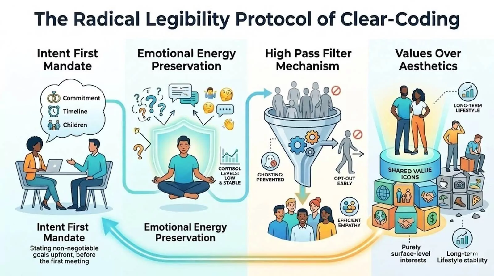 While Truecasting focuses on the public broadcast of one’s authentic life, Clear-Coding takes this a step further by applying that same uncompromising filter to private, one-on-one intimacy. Clear-Coding serves as a high-pass filter for the modern heart. It is a silent sentry at the gateway of our lives. When you state your terms in the first message, you are not being difficult. You are being merciful. This approach removes incompatible matches before a single minute is wasted on a physical meeting. It has triggered a sharp decline in dating burnout. When you lead with the end in mind, the process stops being an interrogation. It becomes an alignment of souls.