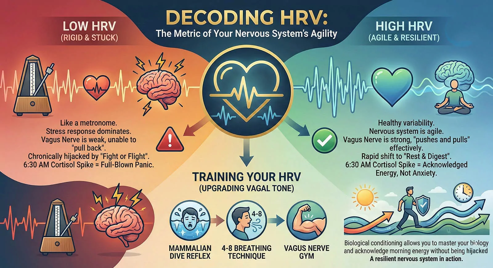 To truly master your biology, you must understand Heart Rate Variability (HRV), the primary gold-standard metric for “Vagal Tone.” Contrary to popular belief, a healthy heart doesn’t beat like a steady metronome; it should have microscopic, healthy fluctuations in the timing between beats. This variability is a direct reflection of your vagus nerve’s ability to “push and pull” against the stress of your environment. A high HRV indicates a nervous system that is agile, resilient, and capable of shifting from high-alert back to “Rest and Digest” in seconds. When you practice tools like the 4-8 Breathing Technique or the Mammalian Dive Reflex, you are essentially “training” your HRV. Over time, this biological conditioning means that the 6:30 AM cortisol spike no longer triggers a full-blown panic response. Instead, your upgraded vagal tone allows you to acknowledge the energy of the morning without being hijacked by the anxiety of the “fight or flight” system.