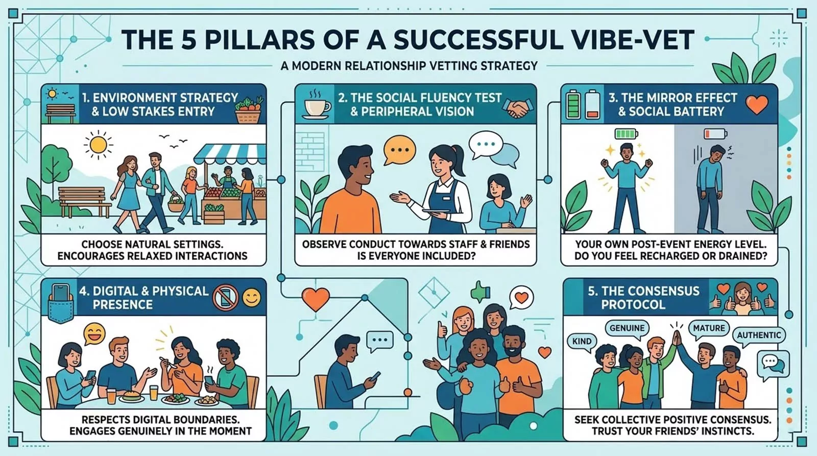 Environment Strategy and The Low Stakes Entry: The physical location of the meeting is your foundation. A loud nightclub is a genuinely terrible place for a vibe-vet. You cannot hear anything. The sensory overload masks personality flaws. You need a low stakes environment. You want a Sunday farmers market. You want a casual outdoor activity. You want a daytime gathering where conversation flows naturally. Choosing these relaxed, accessible settings is the first step toward effective vibe-vetting in relationships.